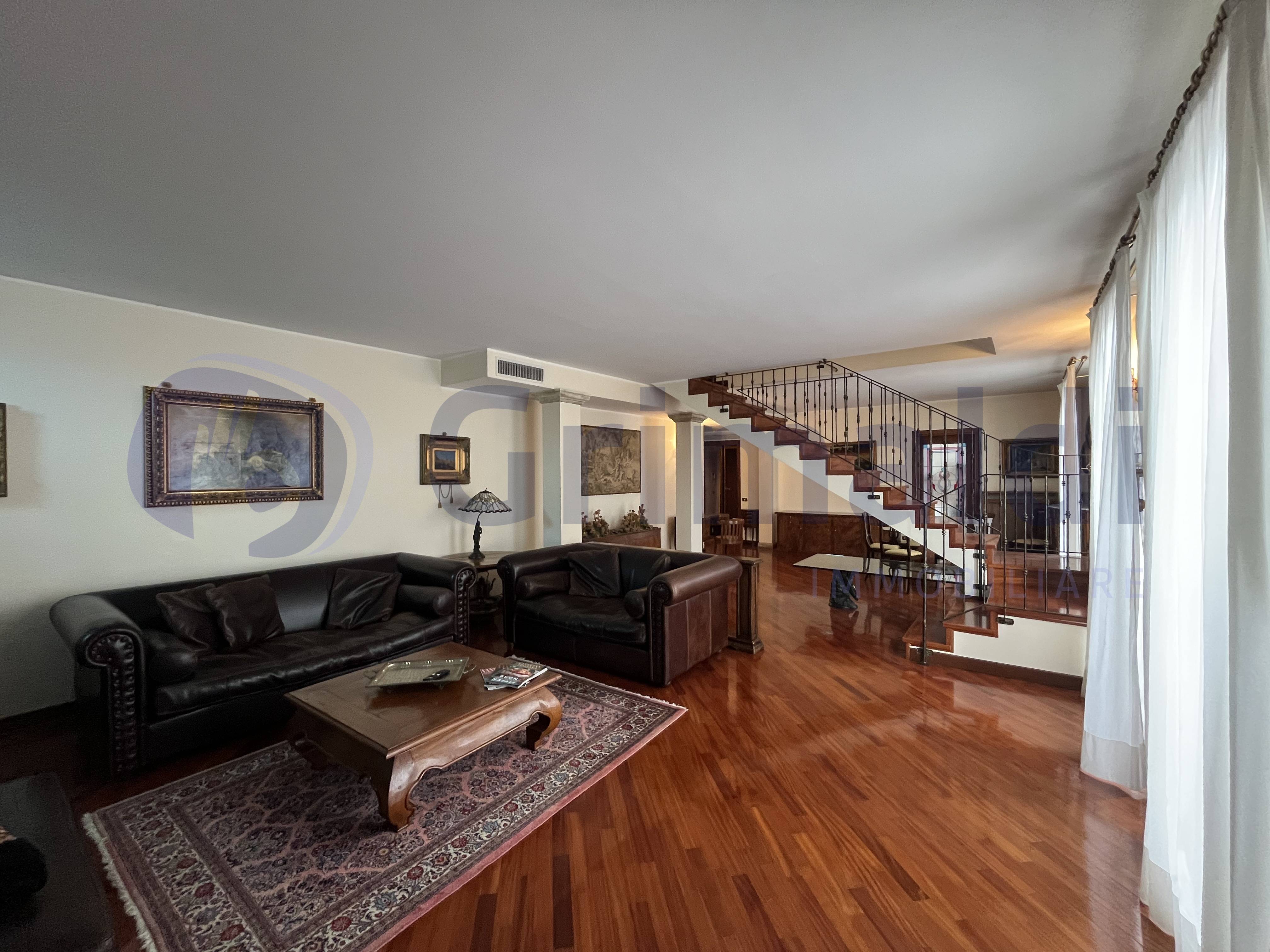 Inserito in ottimo contesto residenziale con giardino alberato ben curato, delizioso e ampio appartamento all'ultimo piano sviluppato su due livelli con finiture signorili. Ingresso con comoda armadiatura a muro, meraviglioso salone con zona conversazione con caminetto e zona pranzo, cucina abitabile separata tutta arredata, bagno con lavanderia; una bella scala a vista in legno conduce al piano superiore con una zona notte servita da un corridoio funzionale a tutte le 4 camere da letto di cui 3 matrimoniali e una singola spaziosa, 2 bagni entrambi finestrati. Al piano primo sotto strada raggiungibile con l'ascensore, spazioso garage di proprietà. Pavimenti in iroko, serramenti in legno con vetrocamera e scuri in legno, impianto di condizionamento canalizzato in ogni stanza, riscaldamento autonomo. La posizione permette di godere di una impagabile tranquillità ma allo stesso tempo di avere tutti i servizi a portata di mano! € 540.000,00 ape 129,63 Cl. E